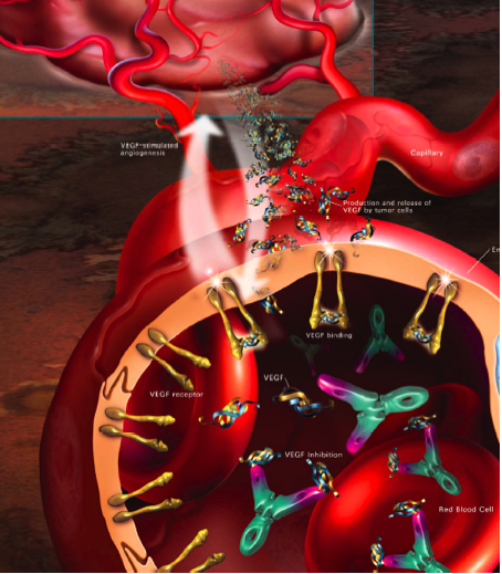 L’avastin a dès lors une action inhibitrice de l’angiogénèse en se liant aux molécules VEGF. Celles-ci ne pourront plus se lier au récepteur VEGF et les vaisseaux sanguins ne pourront plus se diriger vers la tumeur. L’approvisionnement de la tumeur en oxygène et en substances nutritives va se réduire et sa croissance sera endiguée.