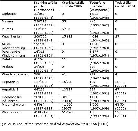 Les vaccinations ont contribué de façon cruciale à la disparition presque totale de certaines maladies en Suisse. Il en est de même pour d’autres pays comme par exemple les Etats-Unis: une étude du Center for Disease Control and Prevention (CDC) a comparé, aux Etats-Unis, les données relevées avant l’introduction des vaccinations avec les chiffres actuels.