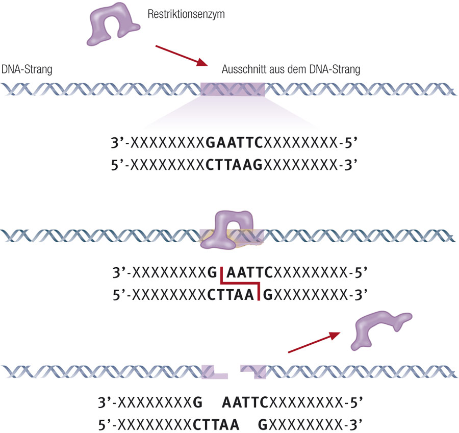 Forschende verwenden zum Klonieren verschiedene molekulare Hilfsmittel. Unentbehrlich sind dabei die Restriktionsenzyme (genauer Restriktionsendonukleasen), welche die DNA an bestimmten Positionen erkennen und schneiden können. Restriktionsenzyme kommen in Bakterien vor und sind mit Wachhunden vergleichbar: Sie schützen die Bakterien vor dem Eindringen von Viren. Die Restriktionsenzyme erkennen die virale DNA und zerstückeln sie in einem Vorgang, den man als Restriktion bezeichnet. Restriktionsenzyme können zwischen eigener und fremder DNA unterscheiden, denn die eigene DNA ist durch eine Methylgruppe chemisch markiert, welche wie eine Fahne funktioniert. Fremde DNA hingegen trägt diese Fahne nicht.