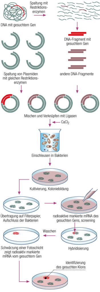 Neben den Restriktionsenzymen sind Plasmide ein weiteres Hilfsmittel für eine Klonierung. Plasmide sind «Gen-Taxis»: Sie können fremde DNA aufnehmen und in Bakterien überführen. Bakterien, z.B. E. coli, übernehmen dann die Produktion der Gene und Proteine. E. coli Bakterien sind die Hauptversuchsorganismen vieler Labors und sind die am besten erforschten Lebewesen.
