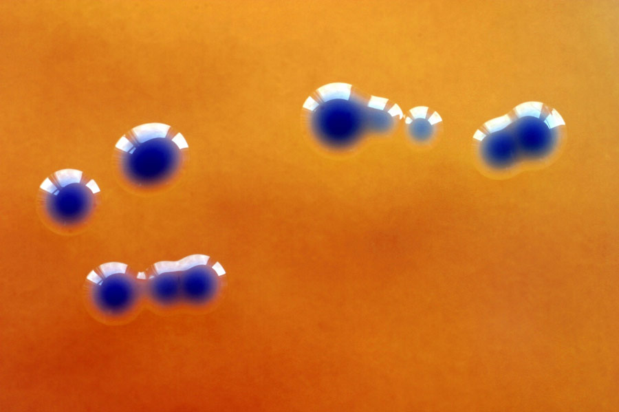 Nun verteilen wir alle Bakterien auf einer Platte mit Nährmedium, auf dem Bakterien prinzipiell aber nicht wachsen können, weil die Platte das Antibiotikum Ampicillin enthält. Mit diesem Schritt teilt sich die Spreu vom Weizen: Alle Bakterien, welche ein Plasmid aufgenommen haben, können auf der Platte wachsen und eine Kolonie bilden, da das Plasmid sie resistent macht gegenüber Ampicillin. Die Bakterien vervielfältigen sich und mit ihnen das gewünschte Insulin-Gen.